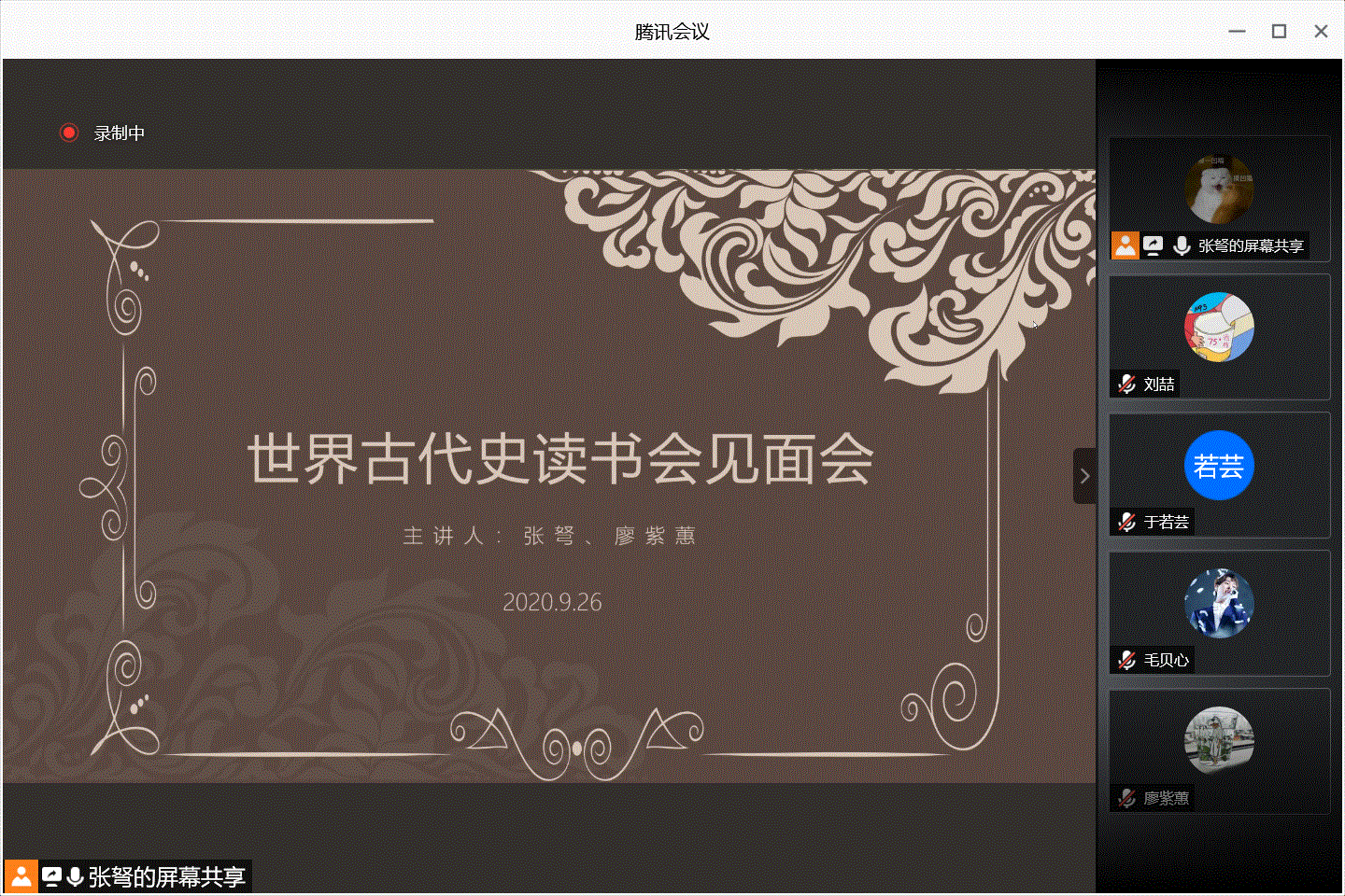 9月26日下午两点,春秋学社在线上举办了本学期第一次世界古代史读书会。本次读书会的主要内容为介绍本学期阅读书目及读书会开展形式,由德赢vwin体育官网登录世界史方向的博士生张弩同学和硕士生廖紫蕙同学主讲。