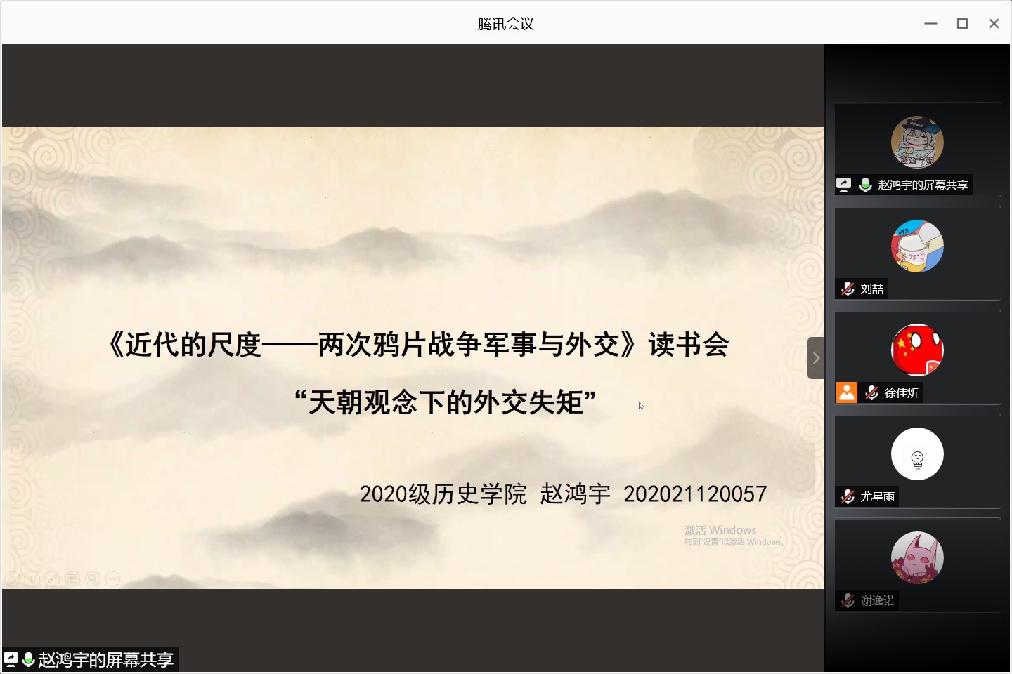 2020年10月24日19:00,春秋学社举办了《近代的尺度:两次鸦片战争军事与外交》(以下简称《近代的尺度》)第二部分“天朝观念下的外交失矩”读书会。本次读书会有幸邀请到德赢vwin体育官网登录2020级硕士生赵鸿宇同学导读。会议由春秋学社常务副社长杨晓锐同学主持。