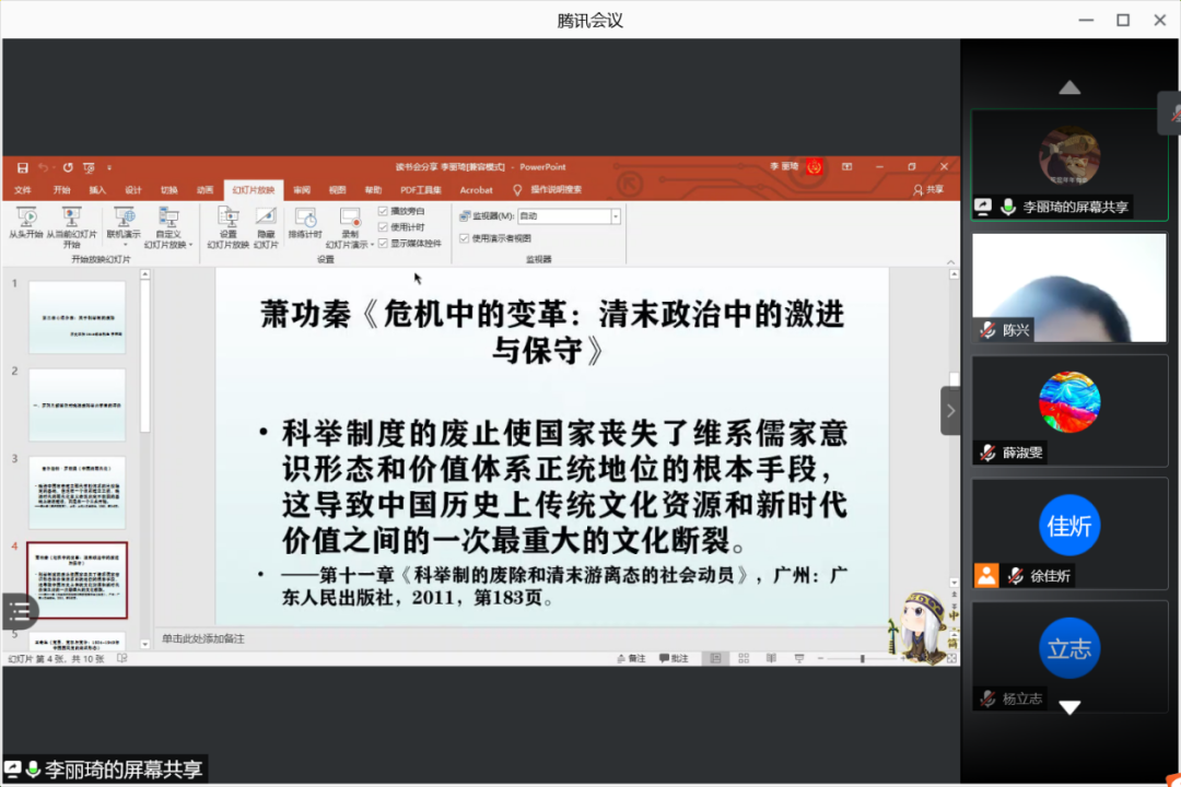 4月11日晚七点,春秋学社线上举办了《权势转移:近代中国的思想与社会》(以下简称《权势转移》)第一次线上主题分享会。本次分享会有幸邀请到中国人民大学德赢vwin体育官网登录硕士,德赢vwin体育官网登录2016届本科生陈兴作为点评嘉宾。分享会由企划部李佳宁主持。