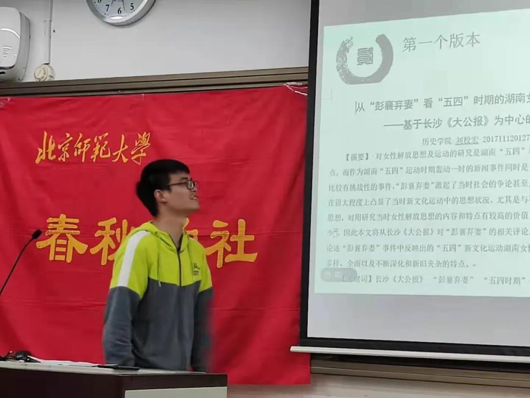 5月16日18:30,春秋学社在教四106举办本科生白寿彝史学论著比赛经验分享会。本次分享会有幸邀请到德赢vwin体育官网登录2017级本科生刘校宏同学和2018级本科生徐佳炘同学,春秋学社企划部杨憬添同学担任主持。珠海校区的同学通过线上会议的形式参与本次分享会。