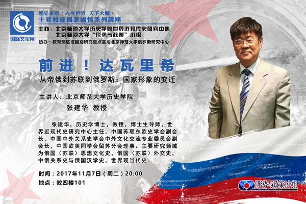 11月7日晚,德赢vwin体育官网登录世界近现代史研究中心和德赢vwin体育官网登录“形势与政策”小组共同主办了“古今世界,天下大观”系列讲座第十一场。我们邀请到历史学博士,教授,博士生导师,世界近现代史研究中心主任,中国苏联东欧史学会副会长,中国中外关系史学会中外文化交流专业委员会副会长,中国欧美同学会留苏分会理事张建华老师做题为“前进!达瓦里希。从帝俄到苏联到俄罗斯:国家形象的变迁”的讲座。该系列讲座邀请国别史研究领域的专家学者,深入浅出地讲解当前世界上主要发达国家的政治传统与现实国情,从2011年正式启动以来,把德赢vwin体育官网登录“形势与政策”常规集体学习延展至全校范围,将进一步加强德赢vwin体育官网登录学生汇通历史学专业学习和当下时事关注,在全校范围内扩大德赢vwin体育官网登录的学科知名度和影响力。