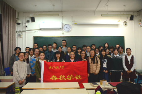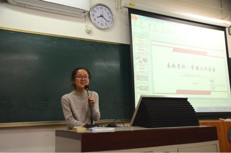 12月16日晚8点,春秋学社在教二105召开本学期第二次全员大会暨期末经验交流会。本次会议由公关外联部马燕妮主持。