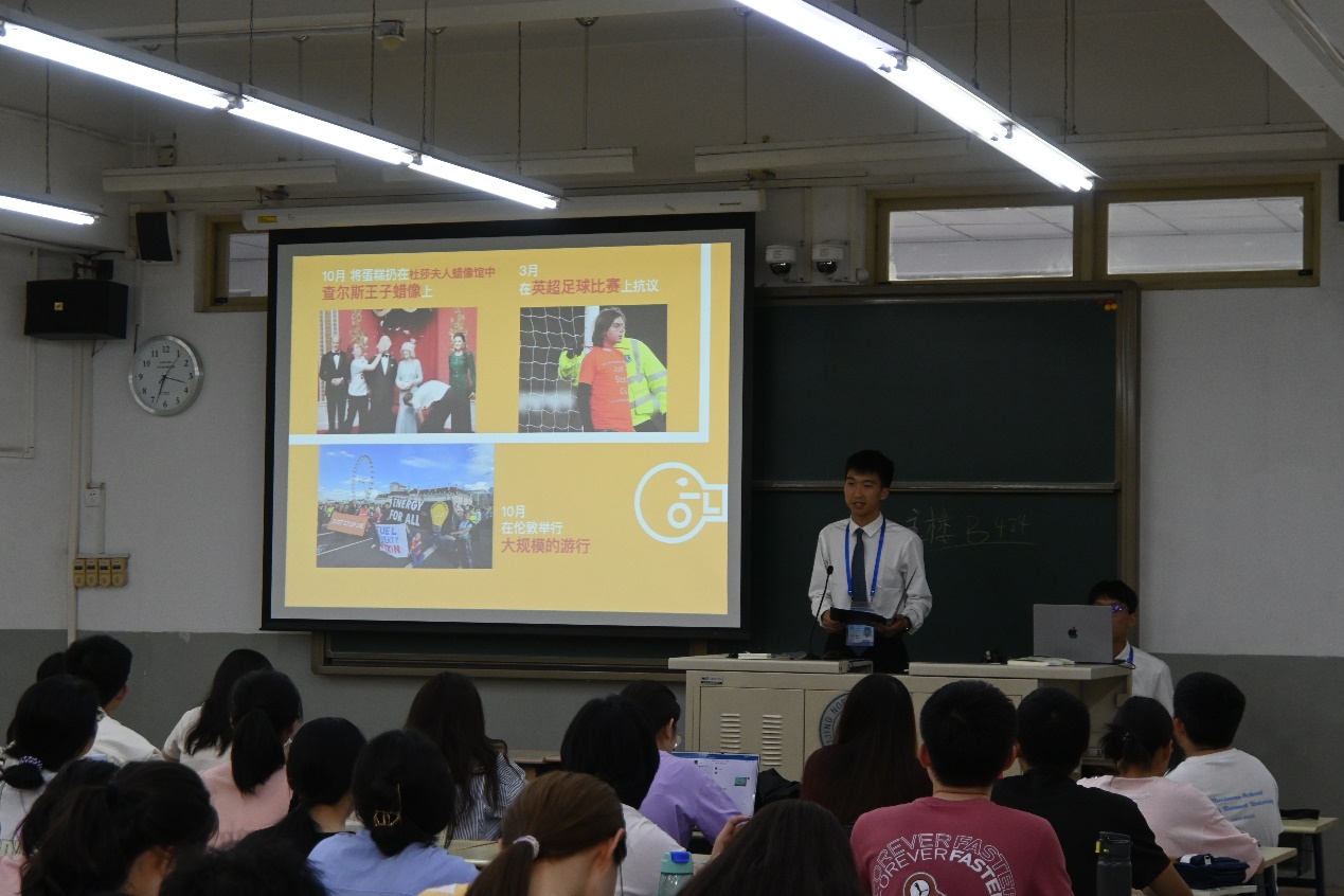 本次授课的主题为《“画外音”——激进环保主义者的行动与诉求》。授课过程中,主讲人赵子正从2022年10月“JSO”组织震惊世人的破坏名画事件出发,追溯了这一组织与其所代表的激进环保主义发展的历程。主讲人通过讲述“环保少女”格蕾塔·通贝里掀起的社会运动、美国退出巴黎协定、德国绿党的发展与变迁、激进环保运动的背后金主等多个事件,为听众较为完整地展示了现代激进环保主义的面貌,用客观冷静的立场总结了激进主义的影响,并展望了全球环保事业的未来。
