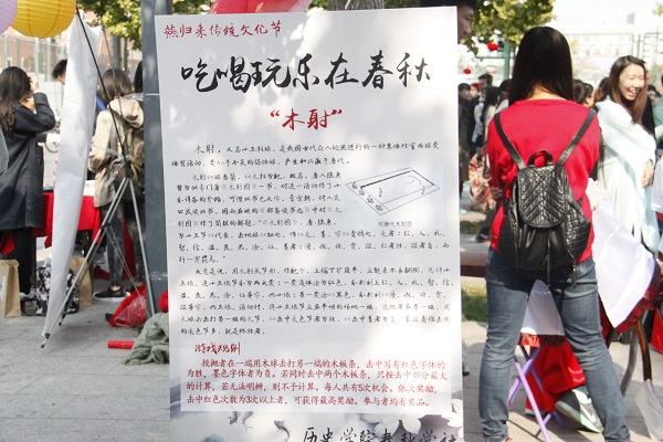 10月18日上午,“燕归来”传统文化节之吃喝玩乐在春秋外场活动在邱季端体育馆西侧举行。该活动由学生团体联合会主办,由春秋学社,民俗学社,行知学社等共同承办,寓意传统文化如燕归来,旨在弘扬中华传统文化、丰富学生的文化生活。