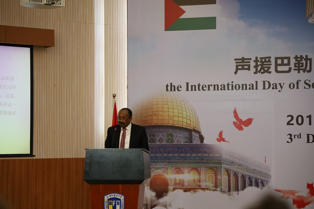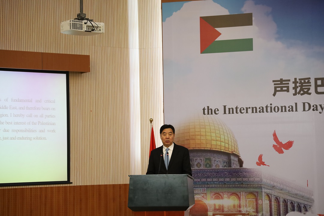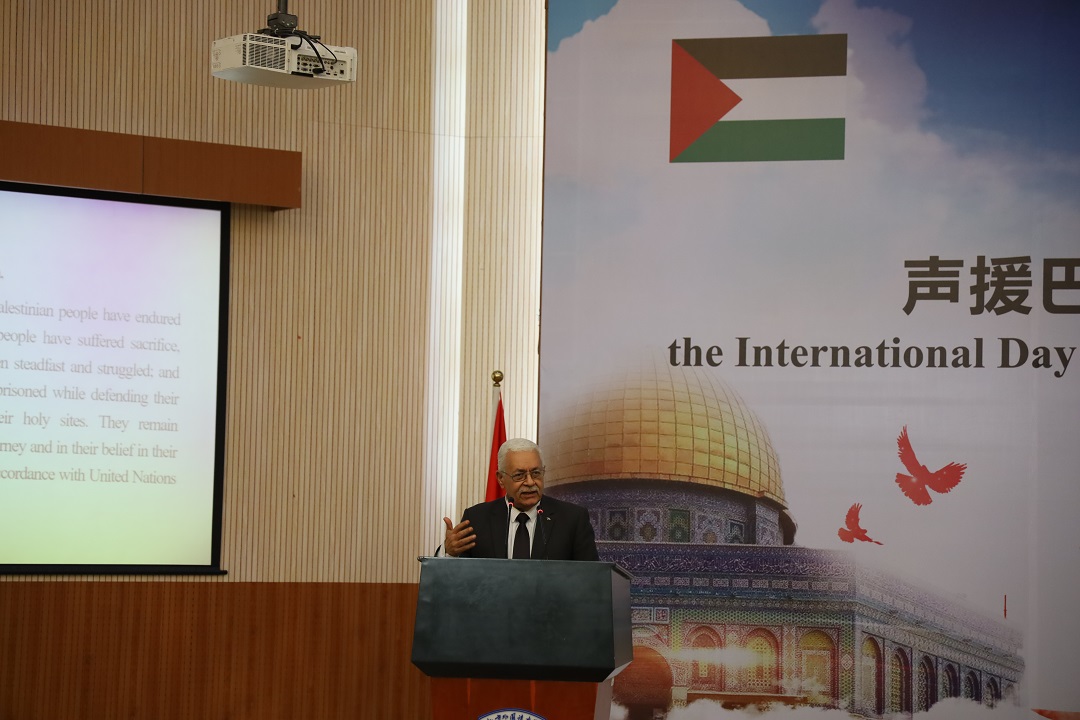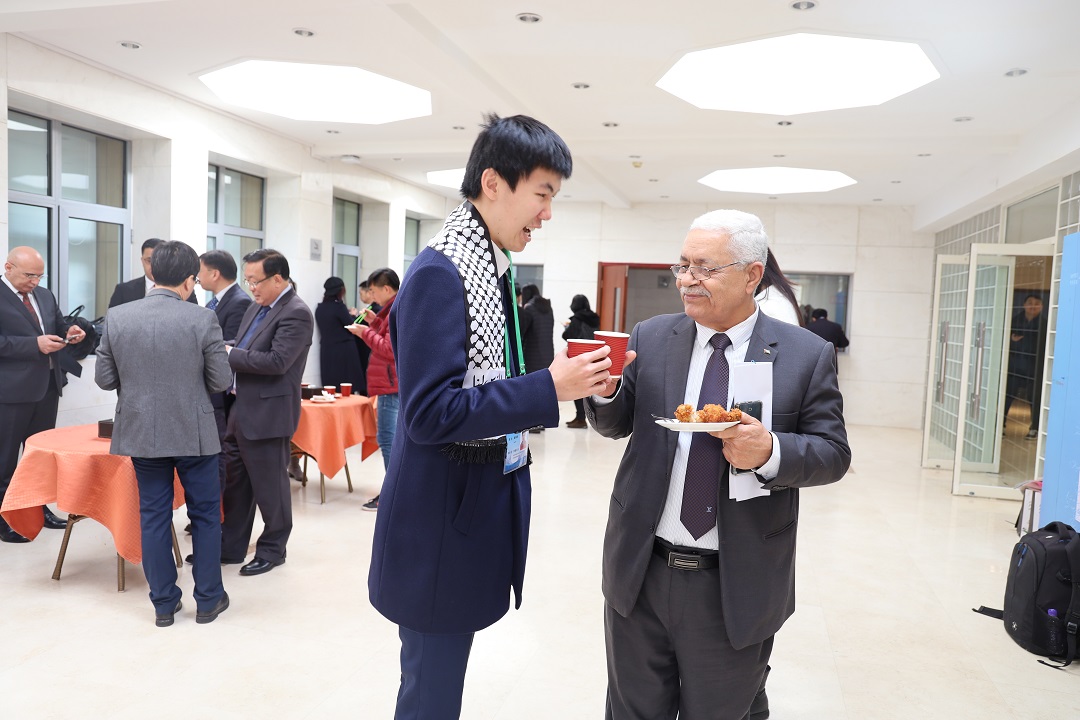 随后,巴勒斯坦驻华大使法里兹·马赫达维宣读了巴勒斯坦总统马哈茂德·阿巴斯(Mahmoud Abbas)的亲笔信。阿巴斯总统在信中指出,巴勒斯坦人民虽然历经了巨大的苦难和牺牲,但是巴勒斯坦人民追求合法权利的信念永远不会动摇。马赫达维大使对中国和其他各方给予身处艰难时刻的巴勒斯坦人民的大力支持表示感谢。最后,大使先生用“If China is strong, Palestine is strong”(中国强,巴勒斯坦则强),再次表达了对中巴友谊的赞赏。