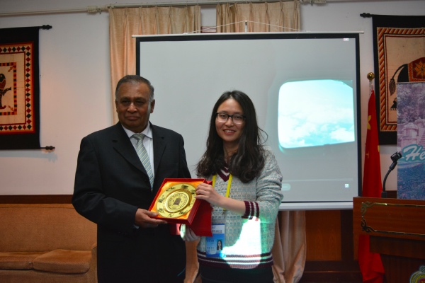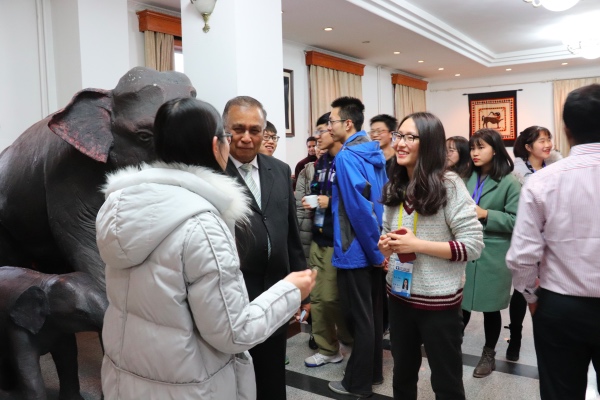 使馆大厅内,卡鲁纳塞纳·科迪图瓦库大使致欢迎辞,对同学们的到来表示热烈欢迎。同学们就斯里兰卡和中国在学生教育、饮食文化、铁路交通等方面的异同等话题积极提问,现场气氛活跃。科迪图瓦库大使及使馆工作人员耐心地回答了同学们的每个问题。当了解到科迪图瓦库大使是一位文学博士,同学们兴致勃勃地询问中斯文学的差异。科迪图瓦库大使认为,中斯两国都有着深厚的佛教文化,东晋时期高僧法显还曾经到达斯里兰卡求经问道,这些文化背景使得两国文学作品有许多相通之处。当问及斯里兰卡红茶的特点时,科迪图瓦库大使表示,斯里兰卡的茶叶最初是从中国引进,经过斯里兰卡高地云雾的滋养,滋味醇厚甘甜,在国际上广受赞誉。当谈到斯里兰卡如何看待“一带一路”时,科迪图瓦库大使强调,早在数百年前,因为海上丝绸之路的连接,中国和斯里兰卡就结下了深深的缘分,习近平总书记提出的“一带一路”倡议,有利于两国实现互利共赢,斯里兰卡也将全力配合“一带一路”倡议的实施和中斯自贸协定推进。大使的答复使同学们对中国和斯里兰卡的共性和差异有了更为细致和深入的体会,也更深切地感受到斯里兰卡独特的魅力和文化感染力。