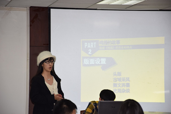 交流会的第一部分是社团展示,各个学生媒体社团采用PPT形式介绍各社团基本情况。《春秋人文报》主编吴姚函首先从报纸沿革、部门设置、报社运营、社团活动等方面对《春秋人文报》进行了全方位介绍。随后,其他两个学生媒体社团的代表也向大家展示了各自社团的特色和风采。细致精彩的展示,使我们对其他兄弟社团的情况有了更进一步的了解,为今后深入合作提供可能。
