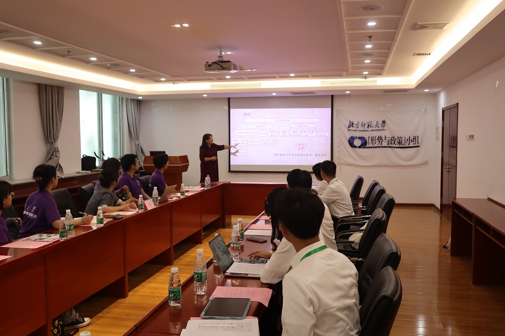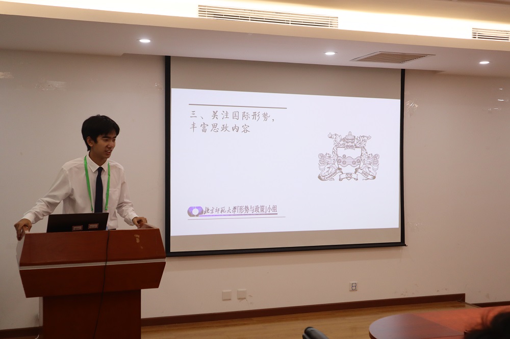 “形势与政策”小组组长许宸睿介绍了小组的历史、发展现状、特色活动以及在学生思政教育方面所取得的成果。“博古通今 胸怀天下”第十一届德赢vwin体育官网登录时事知识竞赛命题组成员黄普凡、李远哲从命题聚焦的国内热点、关注国际形势、呈现思政特色题目等角度介绍了大赛命题中的思政导向;比赛选手杨苒君、杨憬添分享了参加比赛的心得。杨苒君表示大赛传递出的宏大格局、思政导向、家国情怀和世界视野将引导一代代学子不断向前,彰显青年力量。杨憬添从参赛感受和校内外多家媒体对比赛的关注和报道出发,展示了比赛不断扩大的影响力及其在思政教育创新方面的生动实践。在大赛情况介绍结束后,本学期“学生进课堂”活动主讲人刘沉进行了教学展示,获得在场同学热烈反响。