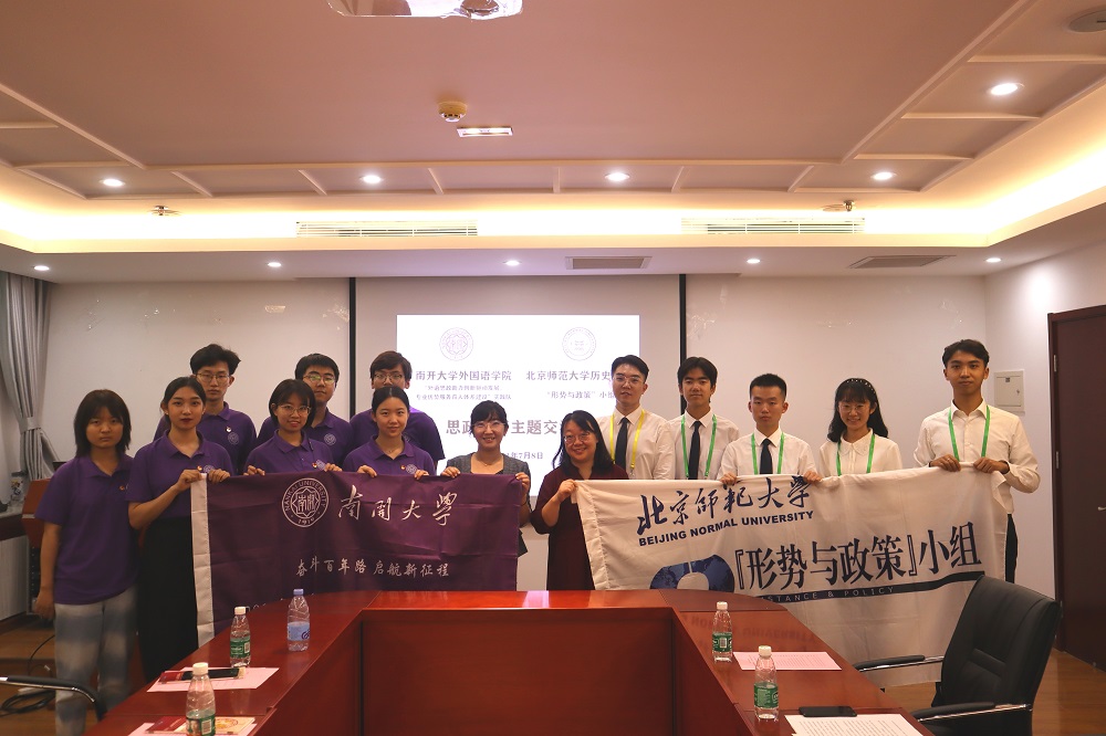 7月8日,南开大学外国语学院“外语思政助力创新驱动发展,专业优势服务育人体系建设”实践队赴我校开展思政教育主题交流活动。南开大学外国语学院团委书记王寅,德赢vwin体育官网登录党委副书记赵云慧、团委书记胡小溪参加,“形势与政策”小组应邀代表德赢vwin体育官网登录参与调研交流。交流会在主楼600会议室举行。