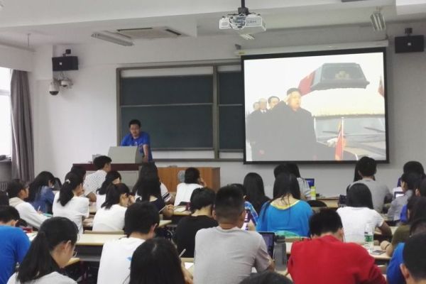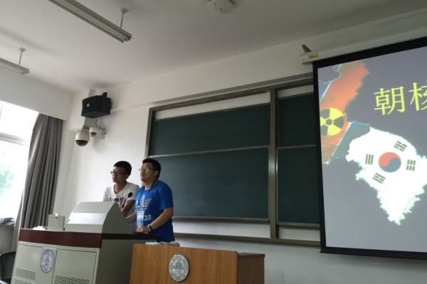 6月13日下午,我校100多名2015级本科生在教七楼202教室聆听了一堂别开生面的《思想道德修养与法律基础》课。课上,赵文博同学在王昭同学的配合下走上讲台,用丰富活泼的形式对当下时事热点进行了生动讲解。赵文博同学授课的主题是《朝核问题:东北亚挥之不去的梦魇》。在短短20分钟的时间里,他以2016年朝鲜第四次核试验为切入点,回顾了此前三次朝核危机的情况,分析了朝鲜核武器发展的动向与朝鲜党政的新变化等。他最后介绍:面对朝鲜半岛的局势,中国要积极推动半岛无核化进程,以六方会谈为基础,维护半岛和平与稳定。