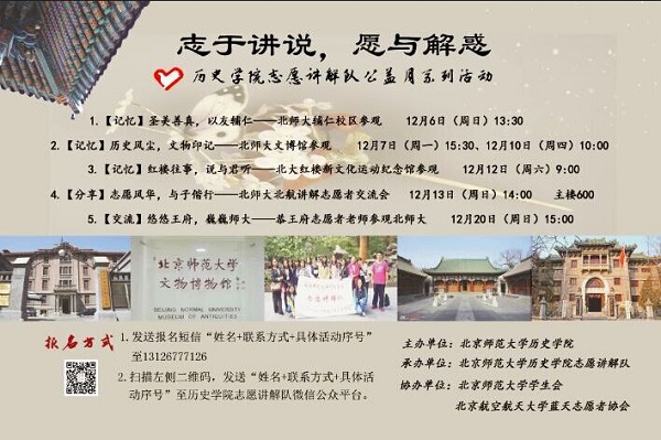 2015年12月6日下午,德赢vwin体育官网登录志愿讲解队主办的北师大辅仁校区参观活动圆满结束。2015年12月5日是第30个国际志愿者日,为积极响应志愿者公益月的志愿需求,德赢vwin体育官网登录志愿讲解队将在12月份开展“志于讲说,愿与解惑”公益月系列活动。本次活动的第一站就是北师大辅仁校区。