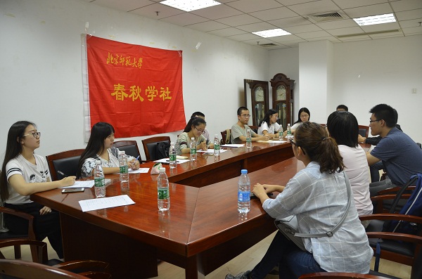 2016年9月9日晚8时于主楼B609室,春秋学社新一届的招新面试顺利进行。此次招新的面试官为春秋学社第33届社长白月、常务副社长王泽、副社长柯棋瀚、范沛沛以及各部门负责人。