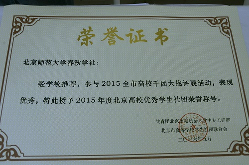 近日,在团市委大中专工作部和北京市高校学生社团联合会组织的北京高校千团大战评选活动中,德赢官网春秋学社获评“北京高校优秀学生社团”。