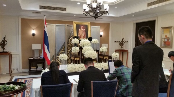 当天的北京天色阴暗,细雨朦胧,凉意袭人,同学们心里也笼罩着一层阴影。一入使馆,同学们在一等秘书谭忠汉的引导下,每人手持一枝白色百合花,在普密蓬国王画像前并排站立,一齐鞠躬致哀。鞠躬礼毕,大家按照顺序依次向普密蓬国王敬献白花,寄托哀思。