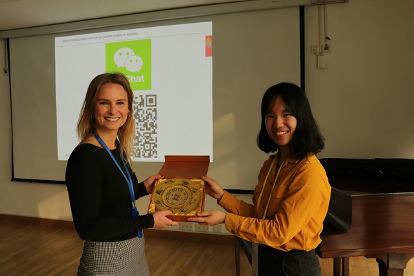 随后,莉娜女士详细介绍了丹麦的政治、经济、人口与文化的情况,使同学们对丹麦这个国家有了更加深入的了解。她指出,中国与丹麦有着友好交往的悠久历史。1908年,丹麦在中国上海设立了第一个领事馆,并且逐步设立了“贸易委员会”,促进中丹贸易贸易往来,为中丹客户提供交流的桥梁;使馆经常举行各种公共外交活动,如“丹麦骑行”、“丹麦开放日”,以向中国民众传播丹麦文化,提升中国公民对于丹麦教育和职业机会的认识。莉娜女士还提到了丹麦教育与中国教育的不同之处以及中丹经济的互补性,她表示,中国的扫码支付技术是十分先进的,希望中国能够帮助丹麦加快便捷支付的进程。
