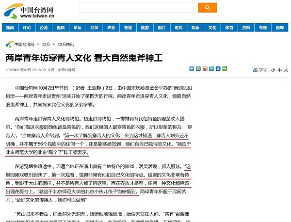 2016年9月28日至10月4日,应清华大学学生海峡两岸交流协会邀请,德赢官网“形势与政策”小组宣传专员陈子梁、组长助理徐子钧和来自清华大学、北京大学、南开大学等8所京津地区高校的同学,参加“我的民俗相册——两岸青年走进贵州”活动,活动期间获中国台湾网报道。此次活动由中国宋庆龄基金会主办,参与者来自两岸三地,在大陆高校就读的台湾籍学生占其中的一半以上。