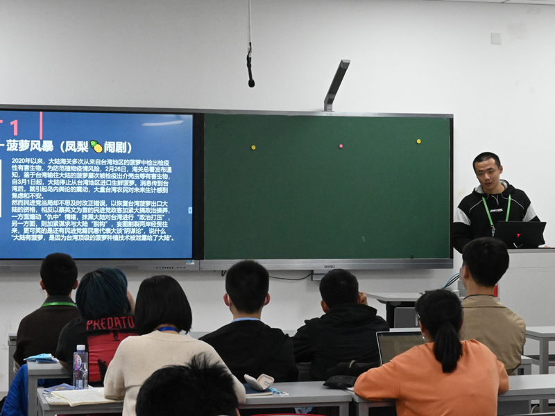 刘钊均的分享由学研专员周逸峰代讲。讲稿选取了台湾岛内的“凤梨风波”、圭亚那“台湾办公室”事件、“莱猪”问题等时事热点,展现了台湾政坛的“喜剧朋克风”。讲演结束后,学研专员周逸峰还对现期台湾岛内蓝营转“绿”、陆美台关系等问题进行了补充介绍。