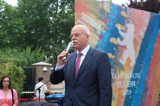本年度德国驻华使馆开放日主题为“2019 倍儿柏林”。上午十一时,德国驻华大使葛策博士携夫人登台发表致辞。葛策大使围绕柏林墙倒塌30周年纪念对世界和平作出展望,进一步表达了对中德两国友好往来的美好期盼。本次活动将“柏林墙”搬进大使馆,邀请了3D画艺术家齐兴华和两位来自中央美术学院的同学在柏林墙上“挥毫泼墨”;之后,葛策大使和演员冯远征挥起锤子砸向“柏林墙”,再现了三十年前柏林墙倒塌的情景。活动间隙,“形势与政策”小组成员葛策大使面对面交流,介绍了小组的特色活动,并向大使先生赠送纪念品。小组成员还观看了探戈和摇摆舞表演,参与到现场“柏林墙”趣味涂鸦活动当中。活动增进了小组成员对德国史,尤其是柏林墙相关历史背景的认识,同学们对当今世界和平发展的重要性有了更深刻的体会。