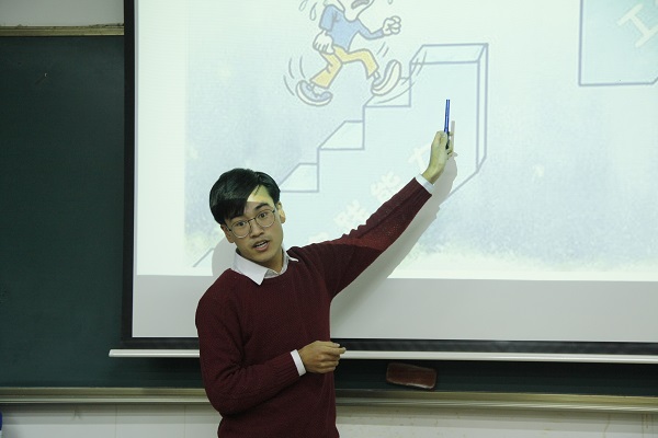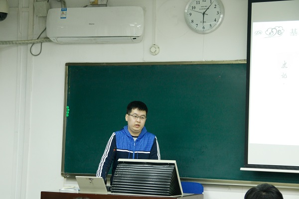 随后,马鸣强同学向大家讲解教学经验。他先从非正式的教学环境讲起,建议大家抓住机会锻炼自己的教学能力,包括上课回答问题、与人交流、课堂展示和教学比赛等。他重点讲解了课堂展示时的经验教训,提出在展示前要做好充足准备,理清思路,保证讲解结构清晰;展示时要注意把握时间,并且关注听者的反应,注重讲解效果;在展示结束后要自我反思。之后,他讲起正式环境下的教学,除了强调认真备课的重要性,他还建议大家与同学和学生多交流,并注重自我反思。最后他强调,在正式的课堂中,需要加强自己的灵活性,增强自己对课堂的调节能力。