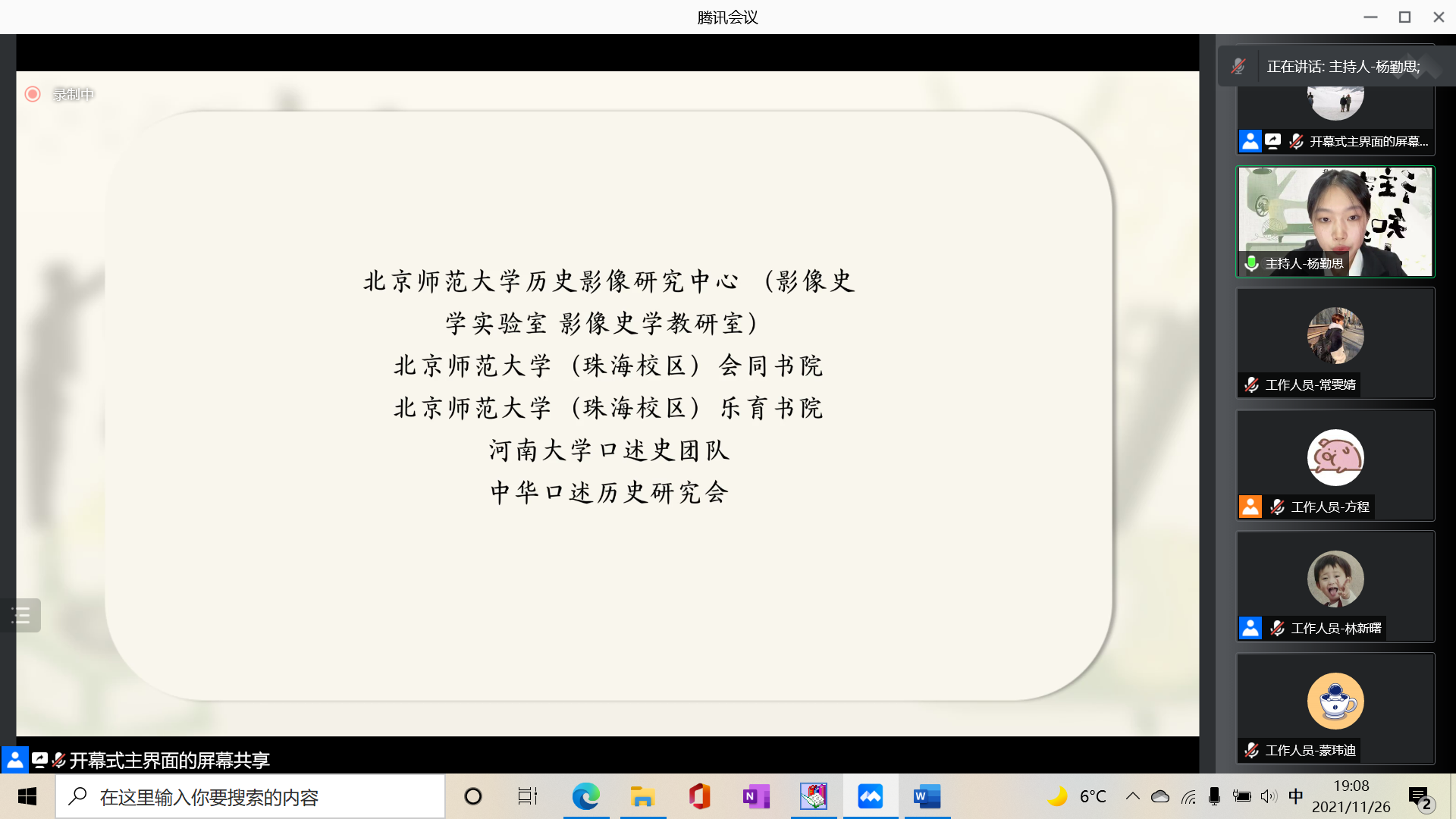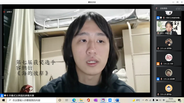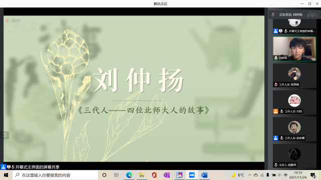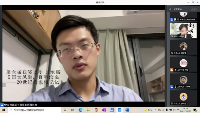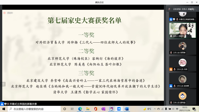 接下来主持人杨勤思宣布了第七届家史大赛的获奖者和获奖作品,并由第七届家史大赛获奖者代表刘仲扬同学和赵佳琪同学分享家史写作中的经验和趣事。刘仲扬同学回忆起了参加家史大赛的经历,讲述了在写作过程中自己如何凭借着对历史的热爱,由一开始的不知所措,到后来走近家人、了解家史,并收获了一份对生活的豁达的经历,最终写下了《三代人——四位北师大人的故事》;赵佳琪同学记录下她的母亲的故事,向大家展现了在改革开放大背景下,一位亲历者的平淡经历。她在温情与敬意中写下了《当妈妈和我一般大时——管窥90年代初改革开放浪潮下的大学生活》。