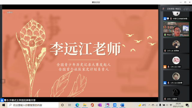 定宜庄老师对家史中口述史的价值做了阐述,详细讲解了如何将自己家庭的私人史与历史的大事件、大背景结合起来进行认识和理解,使大家认识到家史写作不仅能够让我们了解家族的变迁,亦能让我们感受到家背后的国。