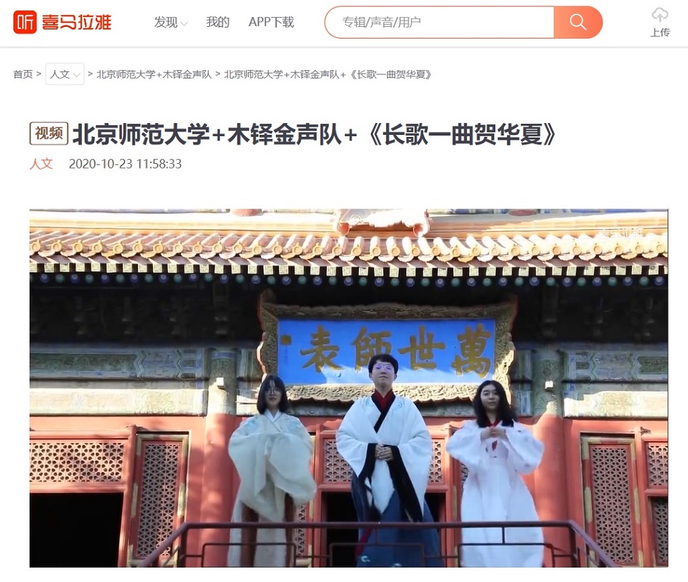 复赛参赛作品以视频配乐朗诵的形式呈现。北师大代表队选取北京孔庙国子监、北师大辅仁校园和校本部三处场景,朗诵《论语》《望故乡》《长歌一曲贺华诞 百年师大正芳华》等符合情境的经典名篇和原创诗歌,配以洞箫演奏,呈现了以“一曲高歌赞华夏”为主题的视频配乐朗诵。代表队邀请校电视台学生主播作为顾问对参赛选手进行朗诵培训,邀请校电视台学生记者团协助拍摄视频并进行后期制作。