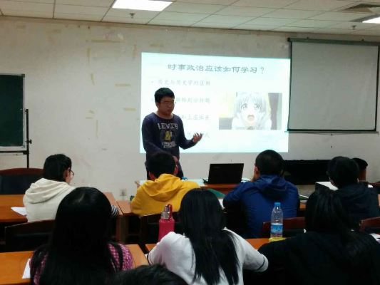 培训中,刘骥跃同学借助图片、数据、表格等多种形式进行了生动形象的讲解。整个讲解分为五大版块,分别是“我们最少应该知道什么?——日本的政治情况”、“安倍晋三这个人的一切——关于日本首相”、“舞台剧的演出——日本政治制度”、“政治斗争观战指南——关于日本的政党”和“他们的未来会好吗?——当下热点探析”。首先,刘骥跃从地缘、历史和现实形势的角度说明我们需要关注日本、学习日本政治的原因,然后介绍了日本的基本概况,包括地理、人口、宗教、国旗国徽等方面。紧接着重点阐述了日本的宪法、政体、天皇、国会、内阁等主体内容,并详细介绍了岸信介、安倍晋太郎、安倍晋三等日本政坛的重要人物和日本独特的“量产型保守政客”现象,简单评述了安倍上台以来的主要举措。随后,他结合目前的统一地方选举,将日本的选举方式和自民党、民主党、维新党、日本共产党等重要政党及其现状全面地呈现给同学们。最后他推测了日本未来的走向,并针对当下热点提出了自己的观点。整场培训深入浅出、内容丰富,扫除了大家关于日本政治的诸多盲点,增进了同学们对我国“搬不走的邻居”——日本的了解与认识,使同学们受益匪浅。