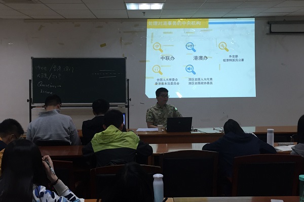 集体学习中,高鑫同学以“香港政治观察”为主题,主要从我国香港特别行政区的基本概况、回归的过程、《基本法》、政治体制、政治力量、重要事件和人物,中央与香港的关系以及内地与香港的融合之路等方面进行介绍。高鑫同学采用大量图片、表格配合讲解,深入浅出,内容详细。通过此次集体学习,同学们深化了对我国香港特别行政区的认识,对于一国两制有了更加坚定的信心。