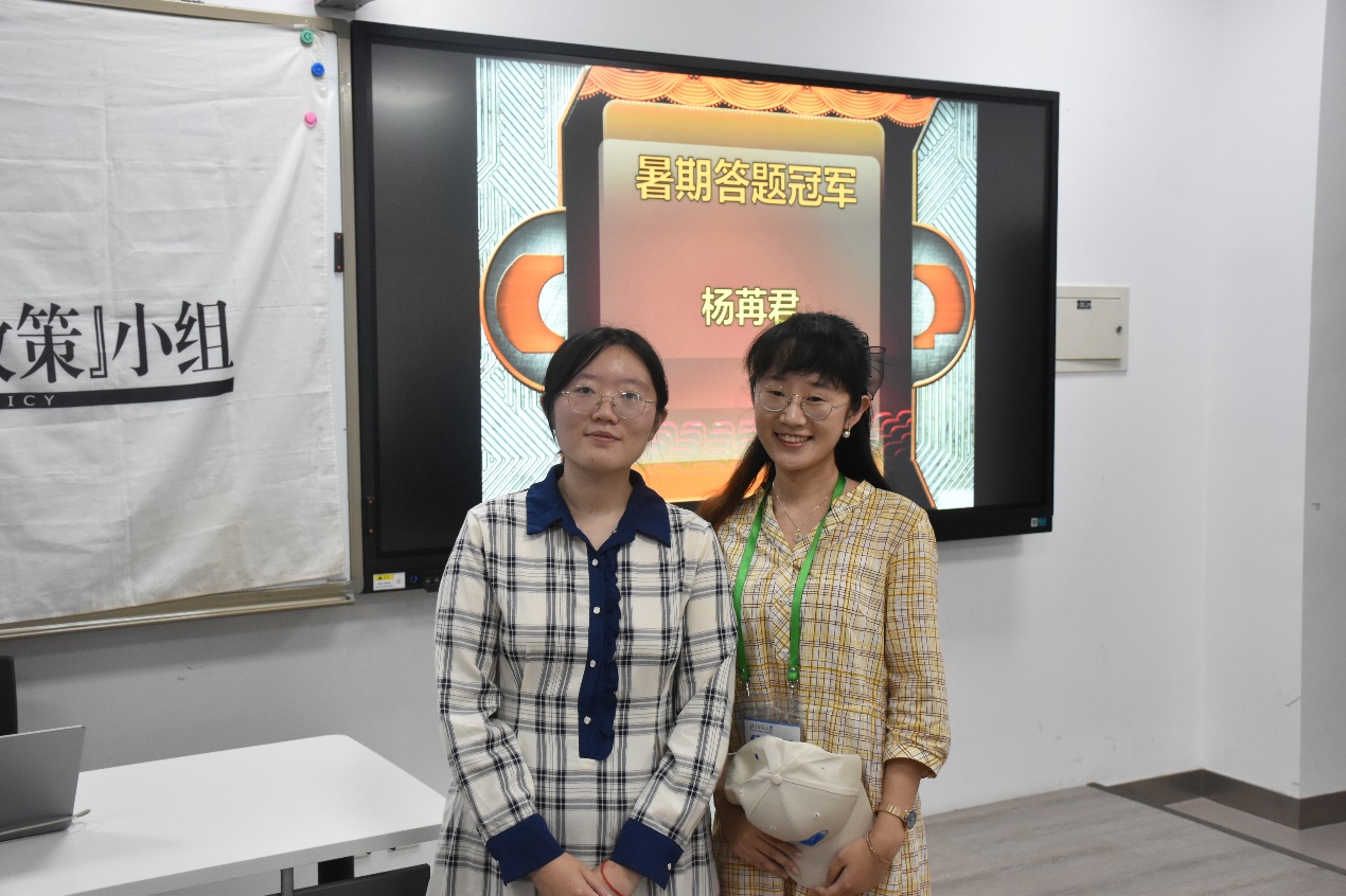 今夏,邢予正推出暑期答题栏目,得到了小组同仁的鼎力支持。经过激烈的答题角逐,杨苒君、张熹、吴弘亮、周逸峰、杨新頔、余子安、郭世航、吴科杰、洪传凯、黄普凡分列总成绩前十位。其中,杨苒君荣获本次答题冠军,邢梦珊老师为她颁发了小组十五周年纪念棒球帽。暑期答题是十六年组史碎片的拾捡、回顾,邢予正历史的书写,也必将在一届届组员手中谱就亮丽的新篇章。