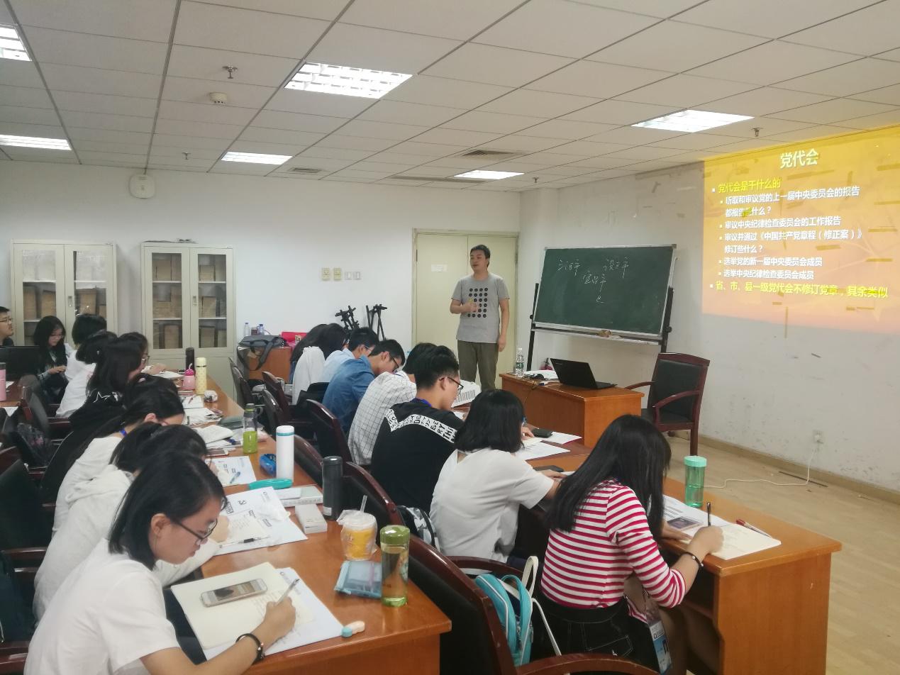 第八十九次培训于9月23日上午十时在主楼A603室举行,此次培训以“我国党政制度基本情况”为主题,特别邀请了我校外文学院毕业生、曾任小组院系联络员的王凌沛校友为大家进行培训。培训中结合十九大、两会等社会热点,配合图表对我国的国家机构、党政知识做出了清晰的梳理。