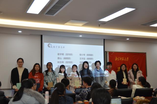 首先,社长王天昊同学带领大家回顾了学社这一学期的工作,展示了每个活动的代表性照片。在过去的一学期中,学社举办了形式多样、丰富多彩的活动,包括讲座、读书会、传统文化外场活动、游览圆明园等。社员们共同回忆并分享学社活动的快乐经历和点滴收获,现场气氛十分活跃。接下来,学社表彰了这一学期的优秀干事,部长们为他们赠送了精心挑选的史学书籍作为奖励,激励社员们在今后的工作中继续努力。