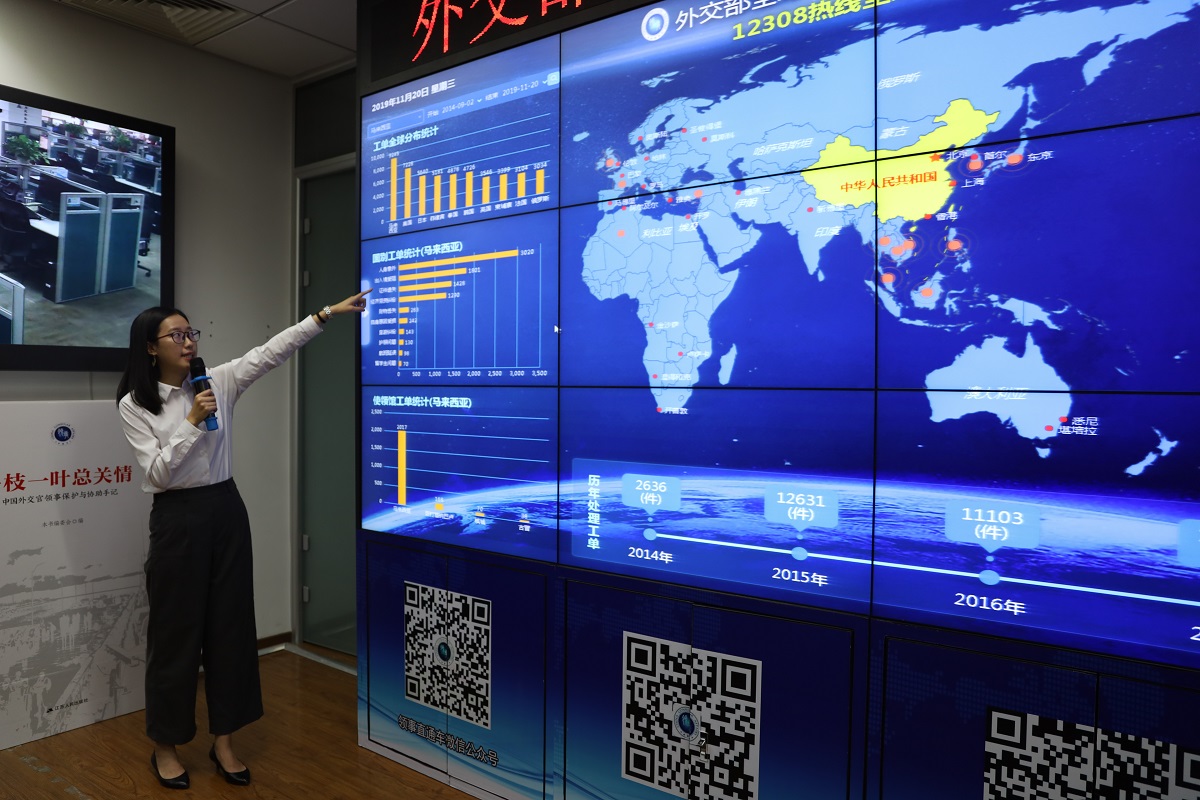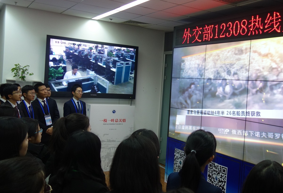 在外交部南配楼大厅,德赢官网学生受到了外交部干部司和档案馆相关部门负责同志的热情迎接。同学们首先来到全球领事保护与服务应急呼叫中心。工作人员通过视频和即时滚动的大数据信息屏,生动、直观地向同学们介绍了“12308”领事保护热线的基本情况,展现了我国政府为海外中国公民保驾护航的艰辛努力,诠释了我国“外交为民”的宗旨。