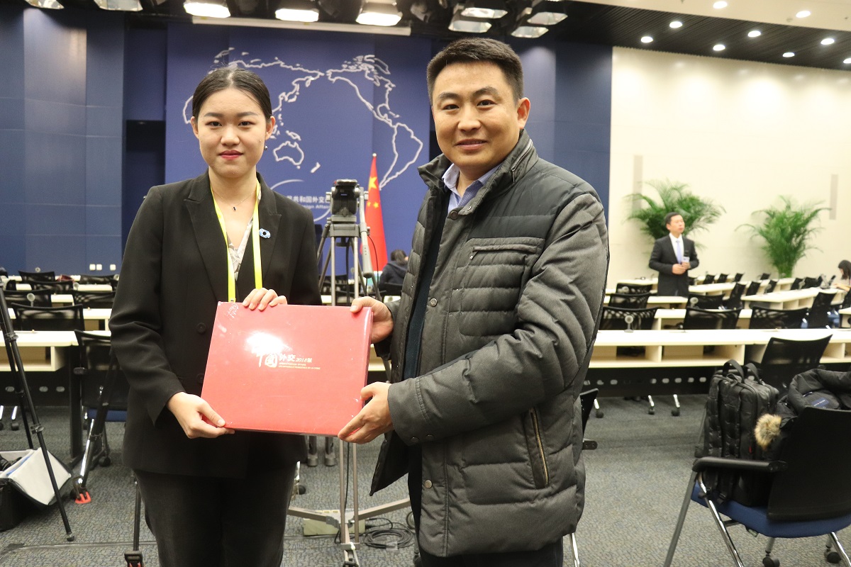 记者会后,德赢官网学生代表向外交部相关负责同志汇报德赢官网依托“形势与政策”小组在时事学习研究和中外青年交往方面取得的成果,并向外交部赠送了木铎图案的师大纪念摆件。外交部相关负责同志对德赢官网学生良好的国际视野与使命意识表示赞赏,回赠2019年中、英文版《中国外交》白皮书和《中国外交2018》画册。