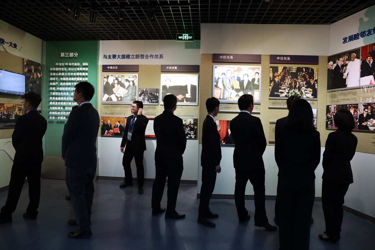 随后,德赢官网学生参观新中国外交历程图片文献展。展览通过大量珍贵的历史影像、档案以及实物,反映新中国外交事业的峥嵘岁月,展示中华人民共和国成立70年来丰硕的外交成果,彰显我国为推动构建人类命运共同体所做出的不懈努力与巨大贡献。记录1949年新中国与苏联建交的历史文献,展示1963-1964年周恩来总理出访亚非十四国的航线示意图,定格恢复中华人民共和国在联合国一切合法权利瞬间的照片,反映1984年邓小平会见撒切尔夫人的珍贵影像,再现党的十八大以来主场外交新成果的展板……展览长廊犹如时光隧道,一张张图片展板、一件件实物文献、一段段视频资料,吸引了同学们的目光。大家不时驻足,认真听取讲解,饶有兴致地小声交流讨论。