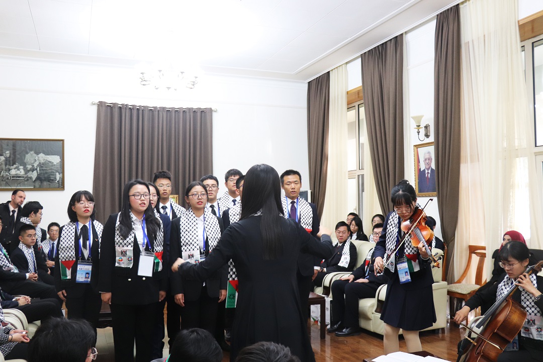 随后,参与活动的全体师生向阿拉法特主席遗像鞠躬、献花。同学们还现场演唱了中国的爱国主义歌曲《毕业歌》。