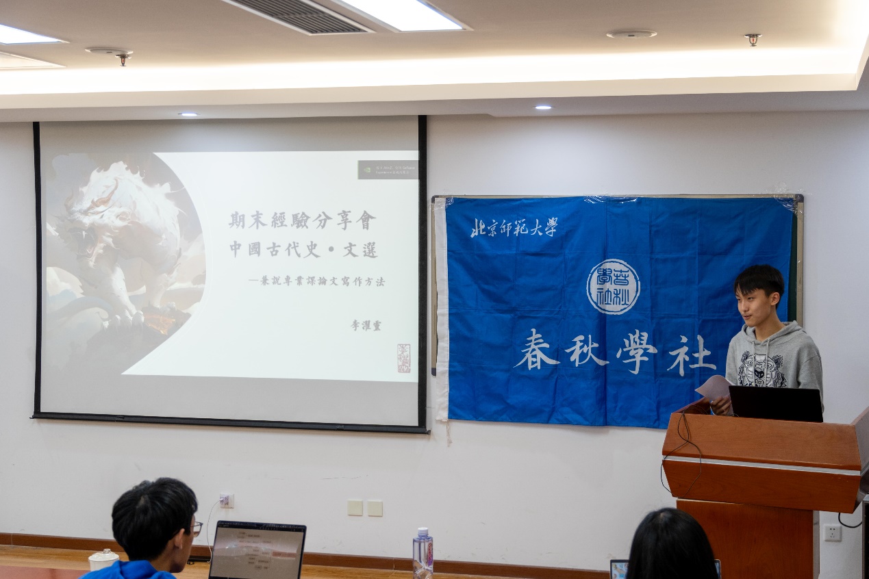 随后,郑可莹同学带来了世界古代史课程的期末复习经验分享。她建议首先整理重点名词解释,以点带面梳理课程知识体系,进而理顺历史事件之间的因果逻辑,形成论述题的答题思路。针对世界古代史知识庞杂、各地区历史交织并行的特点,同学们可以以纵向时间线为轴,尝试每天记忆一个地区的相关知识,分专题掌握。此外,她还提醒同学们在临考前理顺答题逻辑,可以采用总分总的形式分点作答。