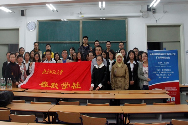 2015年10月30日晚8时,著名历史学家董小川教授的讲座“从新闻署的解体看美国对外文化扩张战略的变化”在教四楼201教室成功举办。本次讲座由由新世界出版社主办、德赢vwin体育官网登录春秋学社承办。讲座吸引了众多历史专业学生和历史爱好者的参与,现场气氛热烈、座无虚席。
