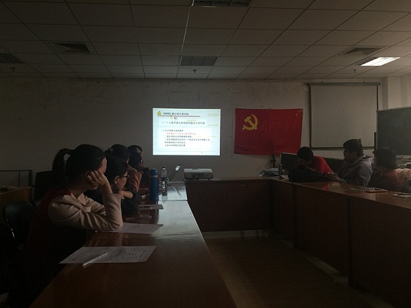 在庄严的国际歌后,党支部书记李娟总结回顾了上学期党支部开展的各项工作,包括支委培训、入党积极分子教育培养等;同时,结合同学实际需求,支部申请并落实完成三项校研工处党建基金。本学期,党支部在继续完善组织建设、制度建设基础上,以建设学习型党支部为目标,结合“纪念抗日战争胜利70周年”的主题,开展师生共建理论学习、专家讲座等活动。