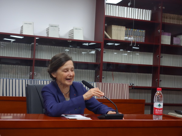 当晚八时,精神矍铄的巴斯蒂夫人甫一步入演讲厅,现场立即响起了热烈的掌声。今年适逢中法建交55周年,巴斯蒂夫人正是在中法建交的1964年来到中国负笈求学,作为两国交往的亲历者和见证人,对中国怀有很深的感情。她首先就能够重访德赢vwin体育官网登录并与师生进行交流表达了喜悦和感谢。谈到年轻时在北京大学学习工作的经历,她饱含深情地回忆起自己求学路上的恩师,感恩于著名历史学家卲循正、陈庆华对她的悉心指导,并对当代中国的青年学子的学术发展提出了殷切的鼓励与期望。