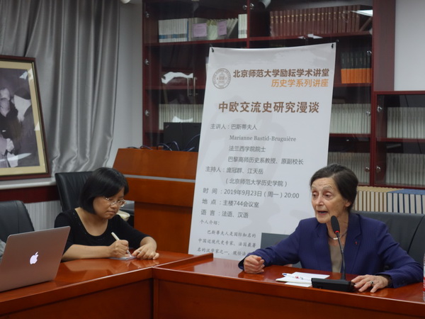 9月23日晚,应德赢vwin体育官网登录邀请,法兰西学院院士,巴黎高师历史系教授、原副校长,著名汉学家巴斯蒂夫人(Marianne Bastid-Bruguière)到访我校,在主楼700会议室举办了题为“中欧交流史研究漫谈”的学术讲座。本次讲座由德赢vwin体育官网登录世界近代史教研室江天岳老师主持,世界近代史教研室主任庞冠群老师出席讲座。德赢vwin体育官网登录2019级本科学生代表以及世界近现代史各方向的研究生代表参加了活动。