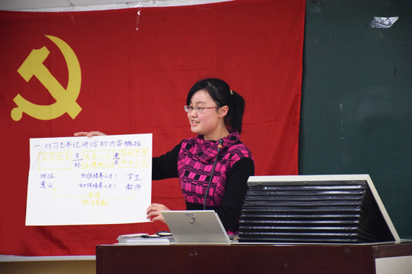 研讨会第二阶段是小组汇报讨论成果。各位代表通过展示谈论成果,分析学习心得。15级预备党员艾烨同志认为要丰富思政课的内容和形式,使得同学们能够正确认识世界和中国发展大势、把握中国特色社会主义的历史必然性、衷心拥护党中央的领导。14级入党积极分子耿佳丽同志,从高校培养什么样的人、如何培养人以及为谁培养人三个方面解读总书记讲话内容。她认为大学生要自觉接受思想政治教育,做中国特色社会主义合格建设者和可高接班人。在各组同志展示完之后,支部书记孟蕾同志作了总结发言,她提出支部要坚决贯彻习总书记的讲话精神,以实际行动做好一名优秀的共产党员和当代大学生。