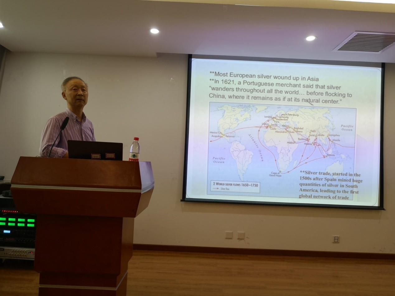 谈到海上贸易,李教授讲到,中国古代外贸第二个历史转变是海上贸易重心从“西洋”转移到“南洋”。海上丝绸之路一直在不断的变化,海上贸易的主要活动区域首先在印度洋,需要等季风航行,海上贸易花费的时间长,中唐地理学家贾耽在所著的《海内华夷图》、《皇华四达记》等著作中,记载了唐代的七条交通要道,其中两条为海路,即“登州海行入高丽、渤海道”和“广州通海夷道”。“广州通海夷道”就是从中国到印度洋的海上航线。唐朝的海船以外舶为主,1998年德国打捞公司在印尼打捞到了一艘运送了唐朝商品的船,但是船内部的生活用品都带有明显的伊斯兰特色。唐朝后期造船技术改进,之后中国船舶逐渐取代外国船舶。到了宋代,造船技术进一步发展,泉州出土的宋海船,本世纪发现的南海一号沉船,都体现了当时造船技术的高超和海上贸易的繁荣,活动区域也不断扩大。李教授在讲座中列举了多张世界贸易路线的地图,说明海上贸易的主要活动区域由“西洋”转向“南洋”。