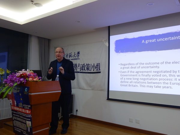 2019年11月27日晚,比利时布鲁塞尔自由大学(ULB)前副校长、政治学与社会学学院院长让-米歇尔·德瓦乐教授(Jean-Michel De Waele)应邀来到德赢vwin体育官网登录,在主楼600会议室作了题为“英国‘脱欧’:往日重现抑或分裂之始”的学术讲座。本讲系德赢vwin体育官网登录励耘学术讲堂的历史学系列讲座,也是德赢vwin体育官网登录“古今世界,天下大观——主要发达国家国情系列讲座”的第十三讲。讲座由教务部主办,德赢vwin体育官网登录世界近现代史研究中心、“形势与政策”小组共同承办。德赢vwin体育官网登录江天岳老师担任讲座主持人,世界现代史教研室主任安然教授出席了讲座。本次讲座作为德赢vwin体育官网登录2019年“国际文化月”活动的重要组成部分,不仅是“形势与政策”小组第108次集体学习,还吸引了我校多个部院系及其他首都高校学生前来聆听,学术气氛热烈。