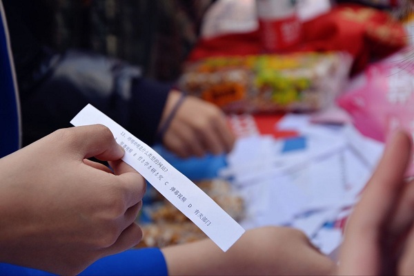 本次活动共设置了五等奖项,每个奖项都对应一份美观实用的小礼物。参与活动的同学可以获得相应的印章,并凭印章在领奖台兑换奖品。活动期间,22个学院共分为9个各具特色的专区,各专区前人头攒动,现场气氛热闹非凡。其中,由德赢官网和数学科学学院共同组织的动漫专区吸引了众多动漫迷前来挑战,电视剧、电影等专区由于与同学们的娱乐生活相贴近赢得了最多的关注,旅游、美食等专区以中外文化为背景,星座、综艺、音乐等专区则主打流行元素。本次活动于下午1时30分结束。