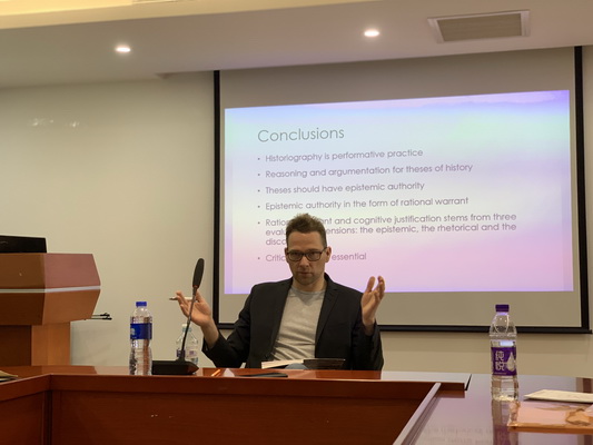 18日上午10时,库卡宁教授开展题为“何谓‘后叙事主义’?”(What is Postnarrativism?)的讲座。首先,库卡宁教授介绍道,他在德赢vwin体育官网登录的三场讲座(包括大会主题演讲在内)可被总结为一句话:史学知识就是获知如何在共同体规则的基础上做出正确的主张。库卡宁教授概括了以海登·怀特和安克斯密特为代表的叙事主义史学哲学的基本观点,指出叙事主义的洞见在于,将史著视为综合性的文本实体。其后果就是:第一,无法再从符合论的角度来评判史学之真;第二,史学负载了一种“强整体论”诉求,史学文本因而成为了不可拆分的整体;第三,史学文本无法被视作一种从前至后的编年史式时间序列。对此,库卡宁教授主张:应当用“受保证的断言”来代替历史学中的“真”,应当将史学视作一种介入并改变既存语境的“述行实践”,应当将历史学家当作批判性的论辩者。这是“后叙事主义”的核心观点。库卡宁教授总结称,后叙事主义更新了史学的求真观点,但这并不意味着一种极端相对主义的态度,即否认有一种标准可对史著的优劣进行评价的。相反,后叙事主义提出了一种评判史学合理性的“三方理论”:可以从认识论角度评价史学是否具有知性权威,从修辞角度评价史学的论证有效性,从话语角度评价史学是否成功介入并改变了现有语境。讲座结束之后,董立河教授对讲座的主要内容做了总结,他认为整场讲座清晰晓畅,使听众受益匪浅。
