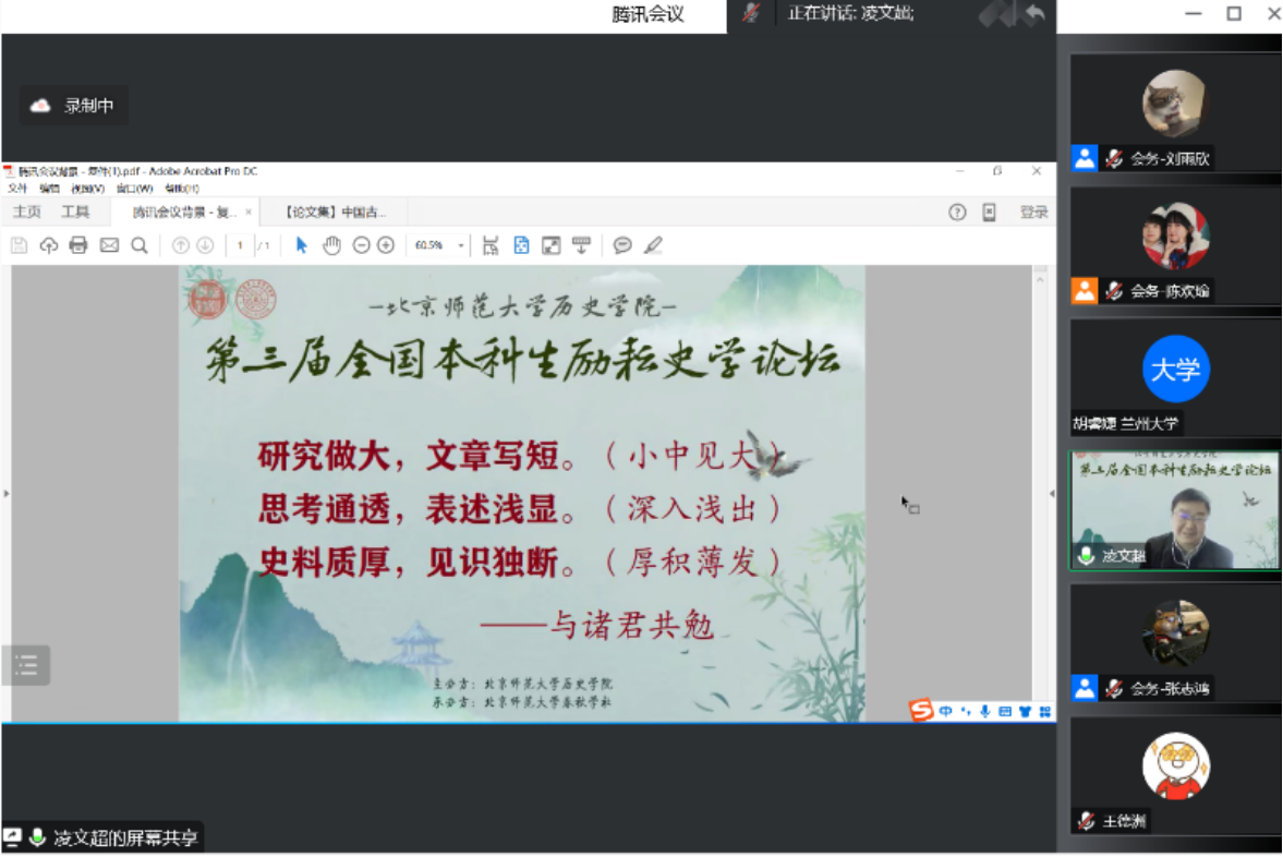 4日下午5时,论坛闭幕式在线上举行,由春秋学社常务副社长温铭瑜同学主持。南开大学的王子超、厦门大学的于悦和德赢vwin体育官网登录的王启轩作为与会学生代表依次发言。三位同学结合自己的学习方向分享了参与论坛的心得体会,肯定了论坛拓展学术视野、增进学术交流的意义,并对主办方德赢vwin体育官网登录和承办方春秋学社致以诚挚感谢。接着,德赢vwin体育官网登录副院长黄国辉教授致辞。黄国辉教授指出,励耘史学论坛是引导同学们发掘学术问题、深入思考探究的宝贵平台,论坛在疫情背景下的成功举办离不开德赢vwin体育官网登录领导的高度重视、春秋学社同学的辛苦付出、与会老师的无私奉献、与会同学的积极参与以及兄弟院校的鼎力支持。黄国辉教授向他们表达了诚挚谢意,并诚邀各位同学今后来北师大进行学术交流。最后,德赢vwin体育官网登录党委副书记赵云慧老师致辞。赵云慧老师肯定了与会同学给予励耘史学论坛建设的宝贵意见,高度评价了本次论坛的价值和影响力,传达了习总书记给德赢vwin体育官网登录“优师计划”师范生的回信精神,鼓励同学们与北师大德赢vwin体育官网登录保持交流,并对论坛发展和同学们的成长致以真诚祝愿。