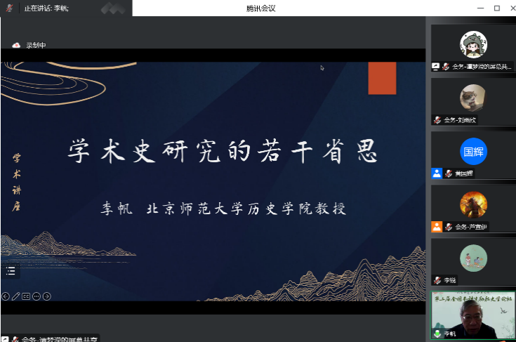 接下来,李帆教授应邀为参会同学开展了题为“学术史研究的若干省思”的讲座。李帆教授运用概念溯源和文字辨析的方法,从主体、客体和外在环境三个维度阐述了“何谓学术史”,指明了学术史、思想史和学科史三者的区别与联系,并以外在环境变化和学术发展内在逻辑为线索,解释了学术史成为“显学”的原因,同时指出当下学术史研究存在的问题,进而以时间脉络阐释了中国近代学术多元化和带有西方色彩的两个特点,加深了同学们对近代中国学术史的理解。讲座条理清晰、层层深入,启发同学们以踏实严谨的态度投入史学研究。