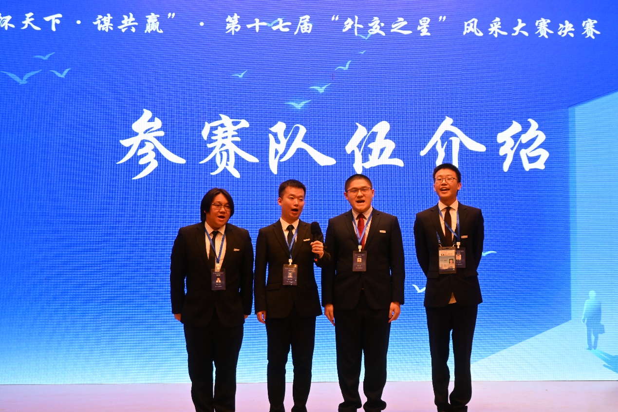 2023年5月20日晚,“怀天下·谋共赢”第十七届“外交之星”风采大赛于北京外国语大学举办。我校德赢vwin体育官网登录2020级本科生黄普凡、文学院2020级本科生吴弘亮、文学院2020级本科生张熹、文学院2022级本科生洪浩哲应邀参加比赛,荣获季军。“形势与政策”小组副组长兼学研专员张正宇、宣传专员洪子阳、外联专员牛广鹏、组长助理易珊羽等应邀前往观赛。