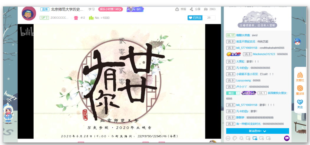 2020年6月28日晚19:00,德赢vwin体育官网登录2020届“廿廿有你”毕业晚会在哔哩哔哩平台成功举办。晚会时长近两个半小时,直播人气峰值达到3000以上,为观众们呈现了一场精彩、难忘的视觉盛宴。