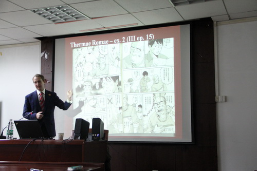 古德教授以罗马与日本浴场文化为切入点,从日本获奖漫画《罗马浴场》、由阿部宽主演的真人电影《罗马浴场》及漫画作者日本艺术家马里山崎(Mari Yamazaki)本人在意大利的多年经历等角度出发,全景式地展现了古罗马文化与现代日本文化的碰撞与互动,细致深入地分析了这一古今交流背后所蕴含的文化批判。古德教授赞扬了漫画《罗马浴场》对古罗马文化各细节的高度还原,对罗马与日本的浴场文化进行了全面比较,阐释了古典与现代文化的冲突和交流,指出不同文化应在良性碰撞之下相互借鉴。